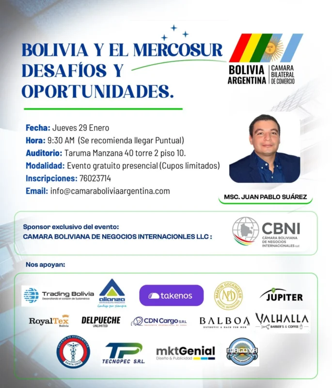 - Organiza: Cámara Bilateral de Comercio Bolivia Argentina.